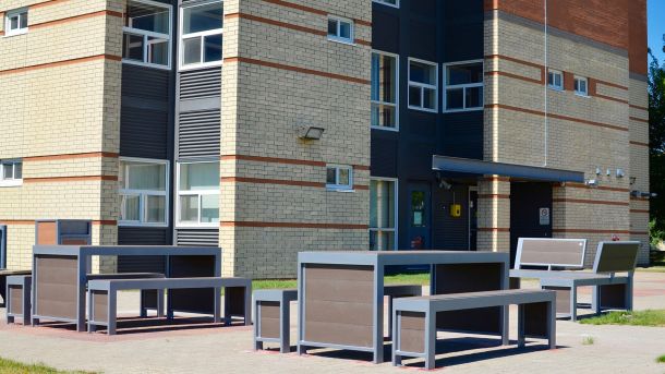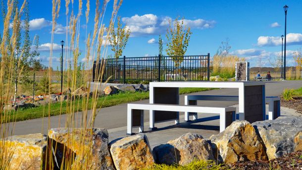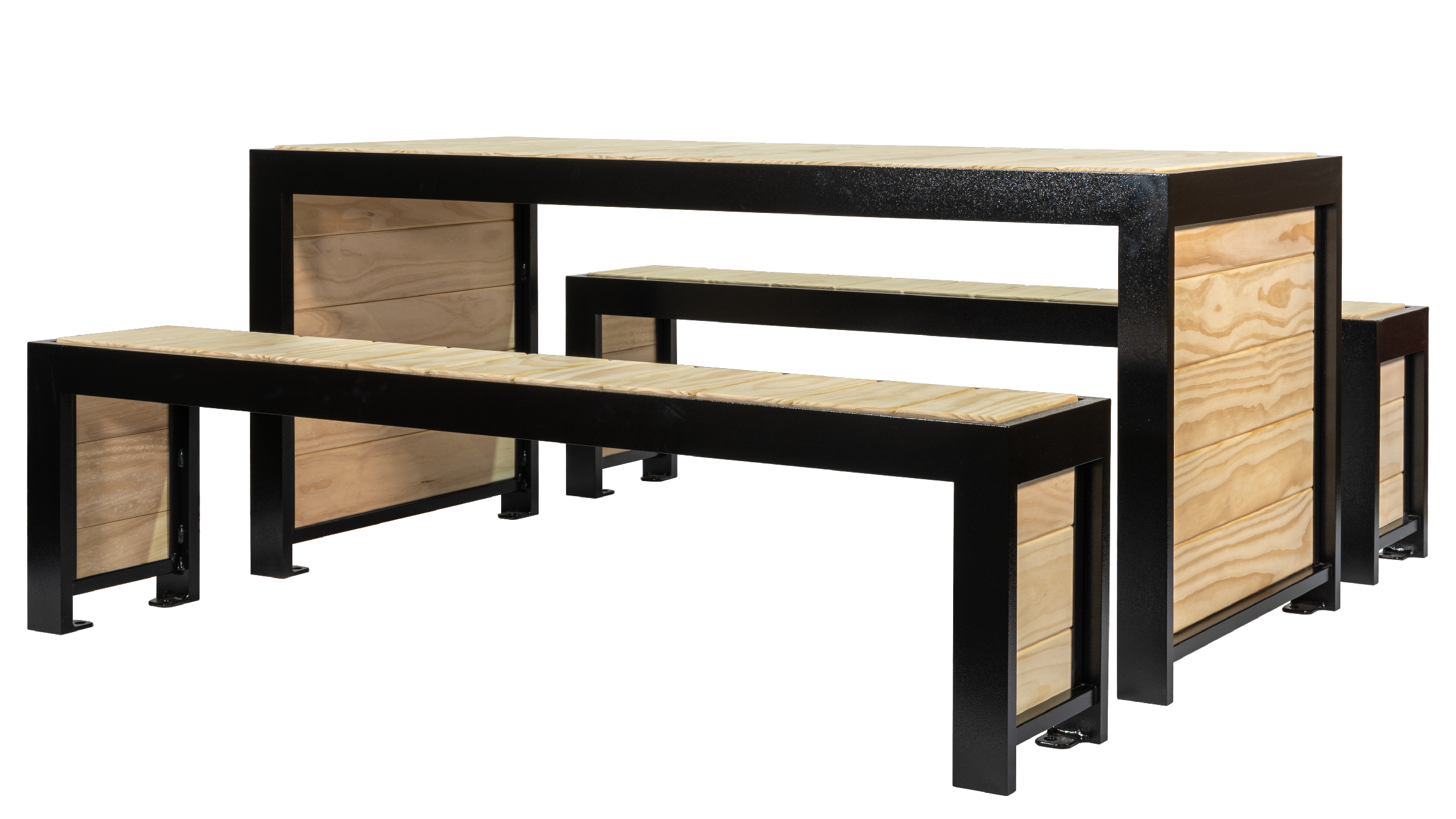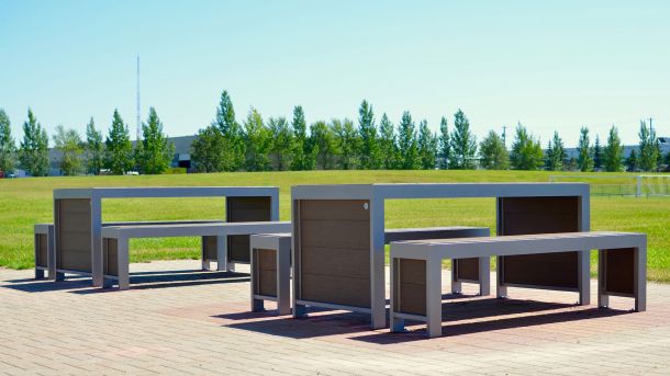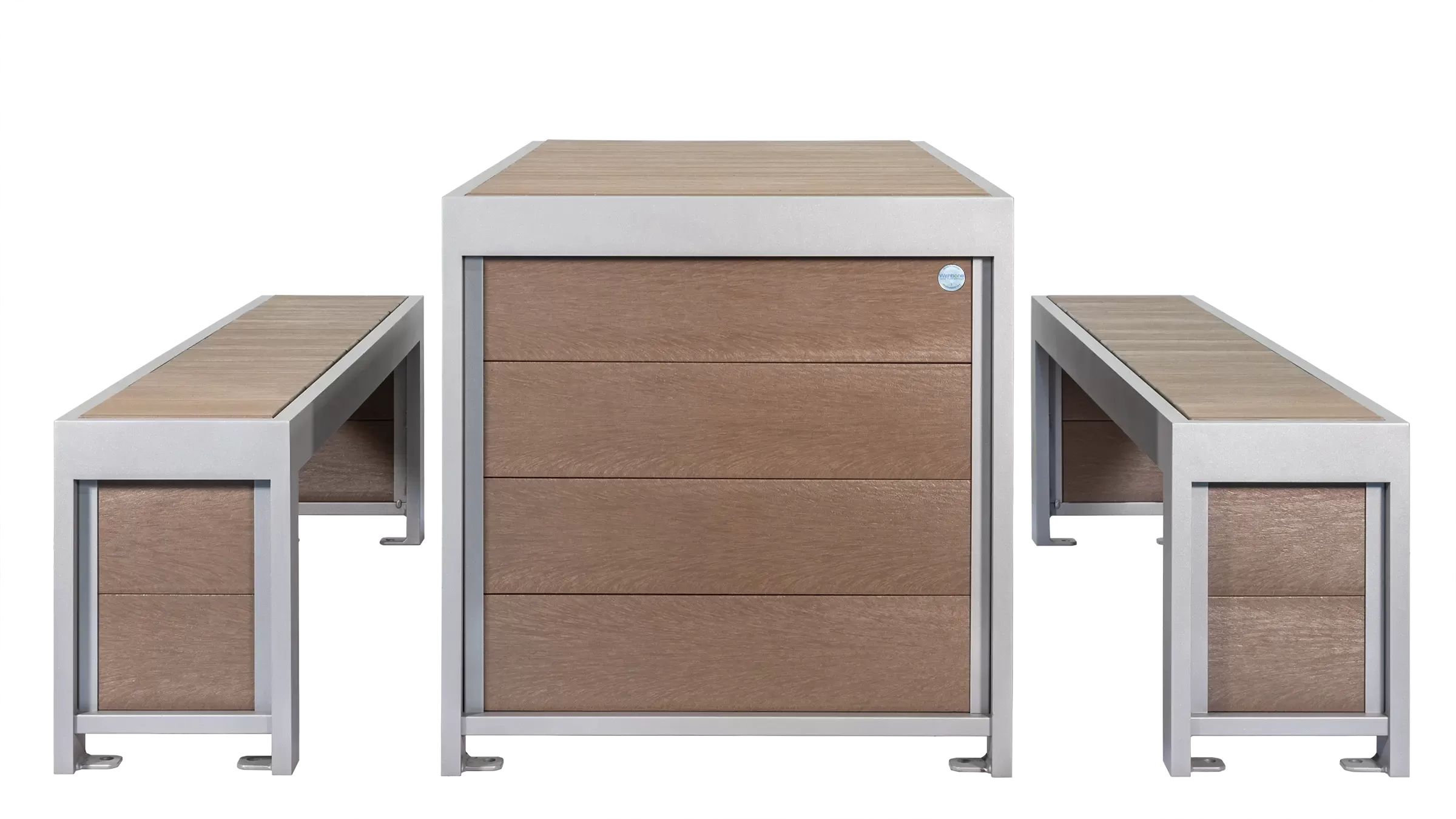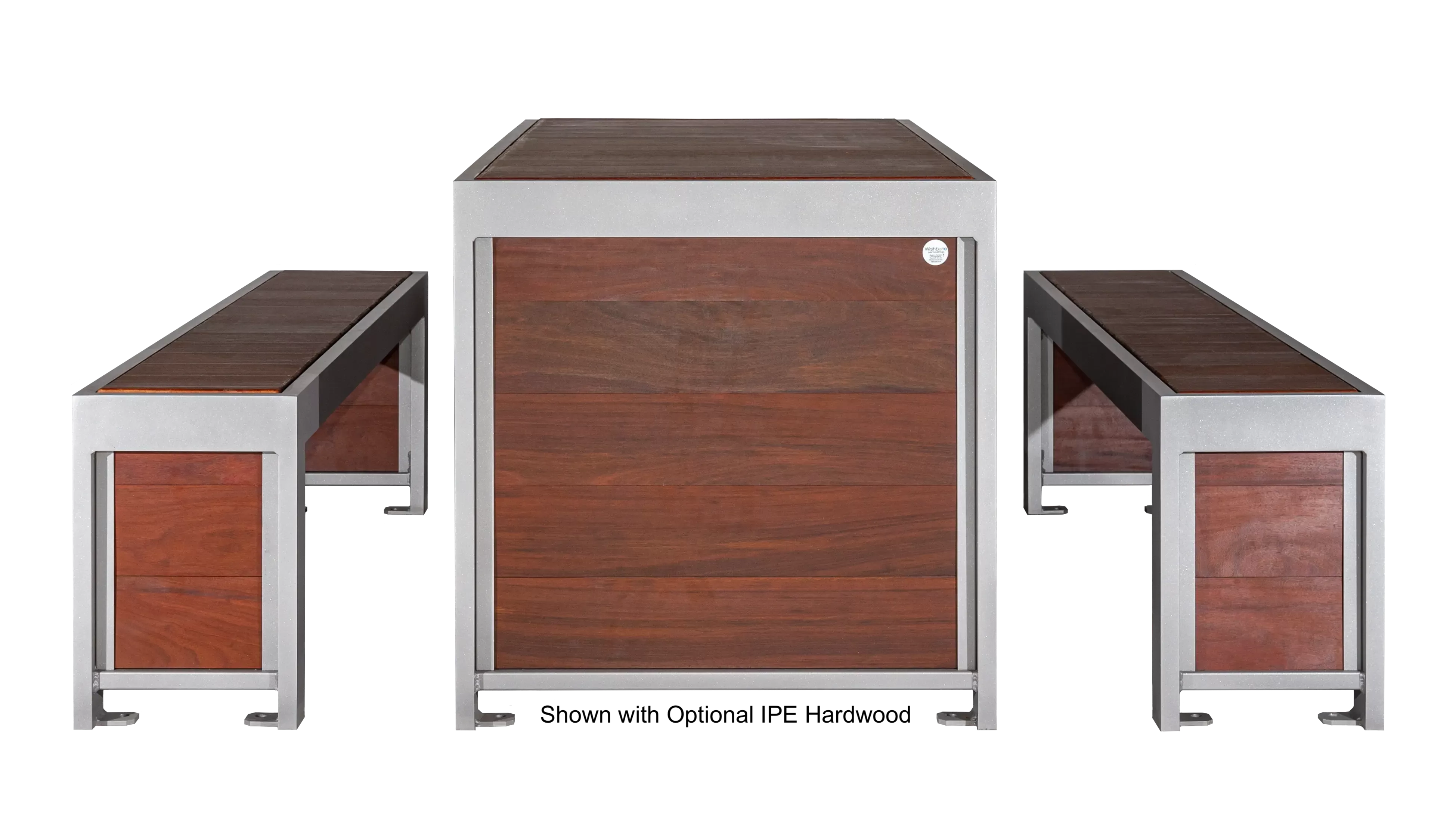 With its rich textures, clean lines, and architectural appeal, the Urban Form Picnic Table was created as a complement to the rest of the Urban Form Series. This model is the perfect showcase of our intentional design philosophy, specifically waste reduction. Using short lumber lengths in the seats allows us to use our own waste material (often cut offs) created in-house. The tongue-and-groove plastic lumber also minimizes the number of fasteners needed, making replacement of damaged boards simple. As with the rest of the series, the Urban Form Picnic Table has a finished look on every edge and surface. The plastic lumber is raised slightly on the seat and table tops to soften the edges and create a more comfortable seating surface. The table is available by itself or with any combination of long or short bench seating. A shorter bench on one side can permit wheelchair access. By omitting the side panels, a different, more open look can be created with the exact same basic design.